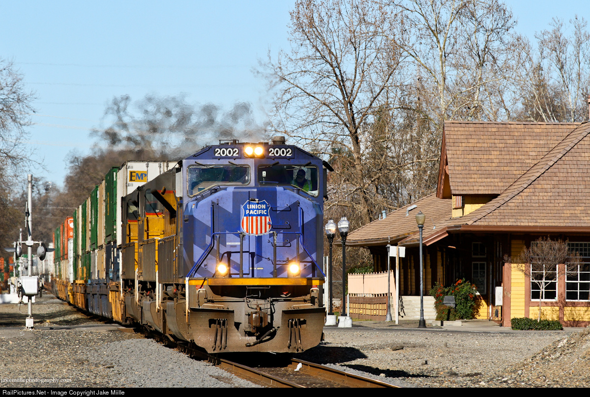 | On a sunny winter morning, Union Pacific 2002 leads the hot ZBRLC past the Amtrak Depot in Chico, California. |