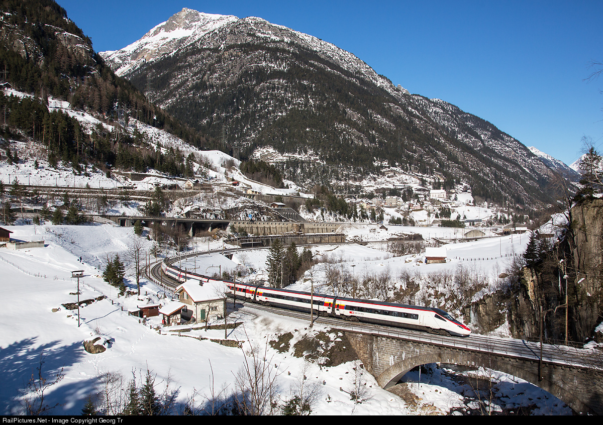 | Since change of timetable in december 2014, one pair of Eurocity between Zürich and Milan is run again with highspeed tilting train of the ETR 610 series. Train EC 17 with ETR 610 # 010 is passing Wassen on the Gotthard north ramp, crossing the Reuss river on the lower Wattinger bridge. |
