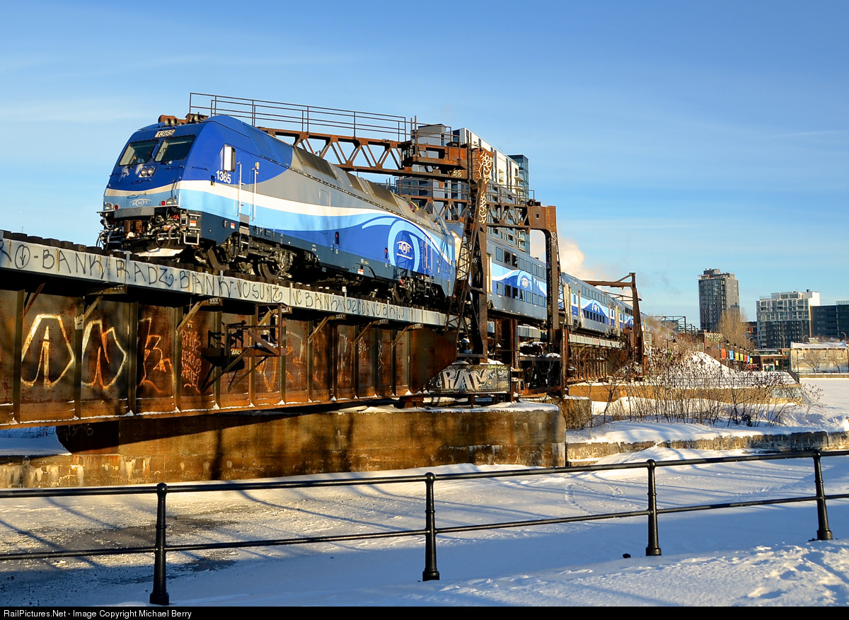 AMT 807 from Mont St-Hilaire is crossing the Lachine canal with dual mode engine AMT 1365 pushing (BBD ALP-45DP).