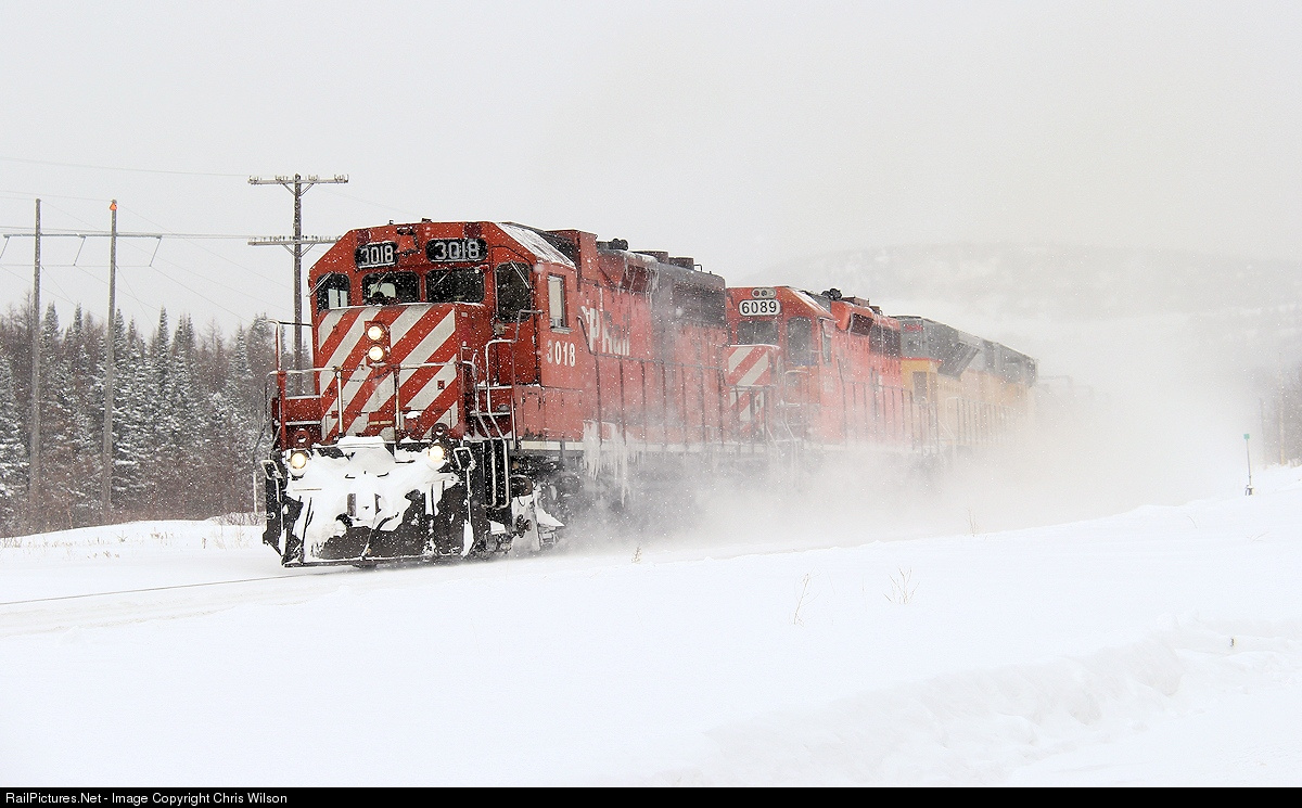 CP 3018, DME 6089, UP 3637 have no trouble pulling an extra Thunder Bay, ON to Sudbury, ON wayfreight through the snow. Today's train has 11 mixed/40 CN Haulage/15 mixed.