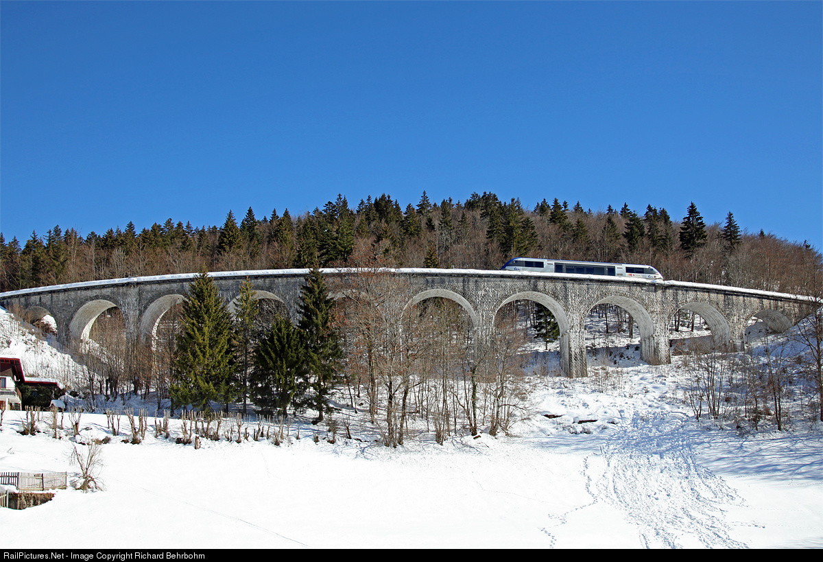 | X73613 is crossing the "Morbierviaduct" on the line Andelot - Morez - Saint-Claude. |