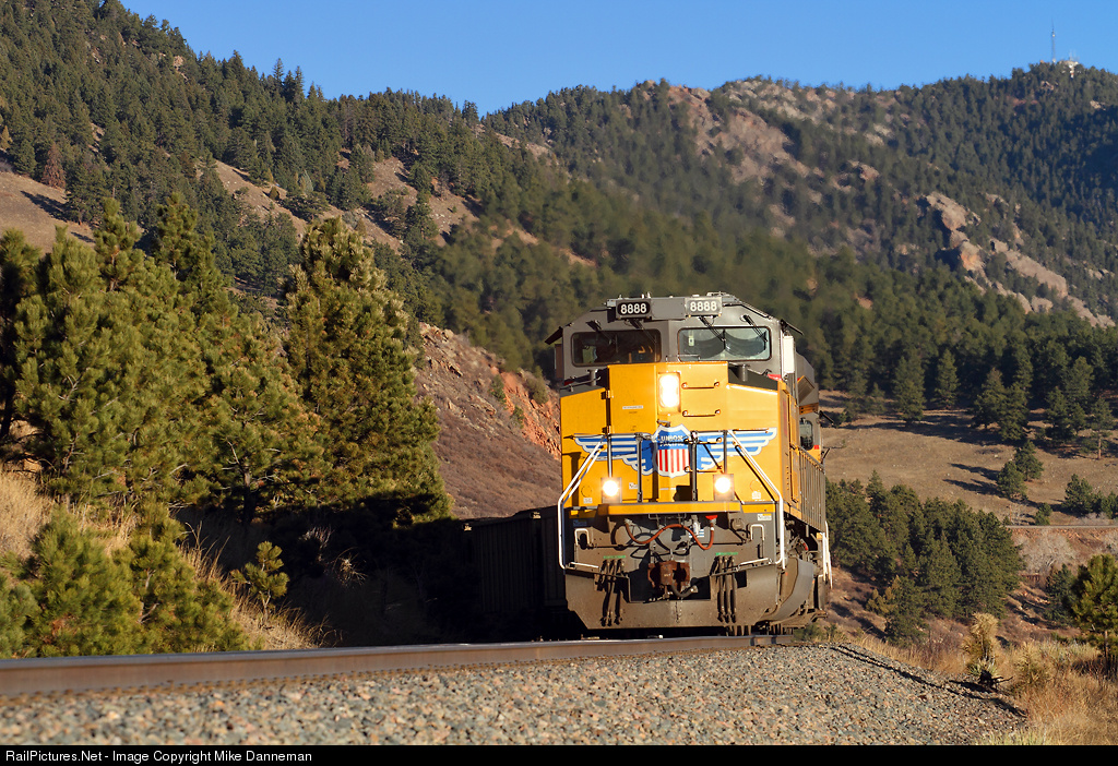 Union Pacific coal load CEYPS curves past milepost 22 just west of Eisele (Clay), Colorado, early in the morning of February 9, 2015. UP No. 8888, built in 2014, is a heavy EMD SD70ACe that UP labels a SD70AH and leads the train of XCEX cars eastbound toward Public Service in Denver.