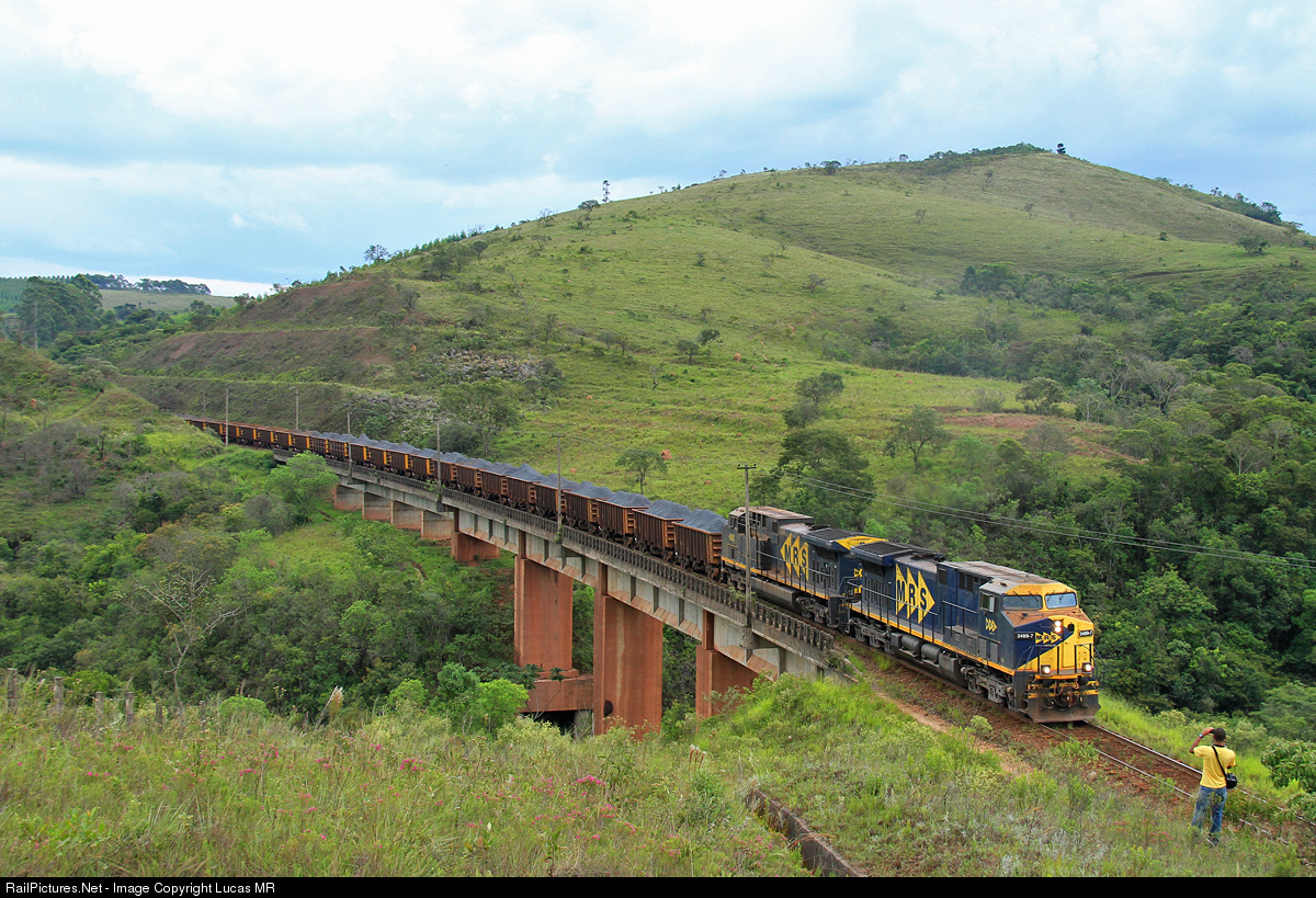 | Southbound loaded train at Ferrovia do Aço, running from P2-5 to Bom Jardim de Minas-MG, photographed at km 103. |