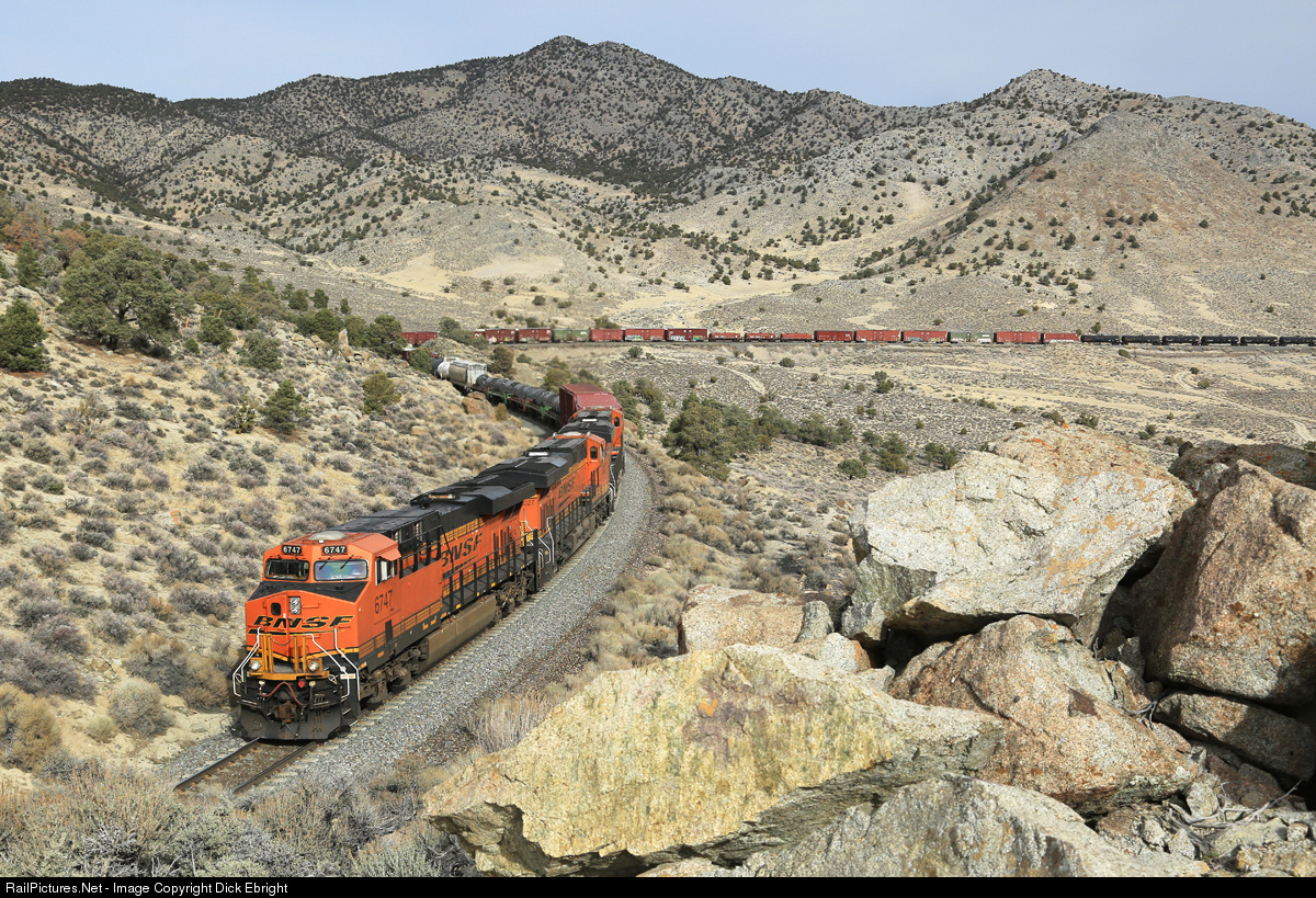 | The clouds that had kept this day dark and gloomy started to break up and dissipate just long enough to illuminate the three times a week Provo, Utah to Stockton, CA BNSF manifest on the UP’s Shafter sub. The location is the upper level of trackage on the westbound climb to the summit of Silver Zone pass in eastern Nevada. |