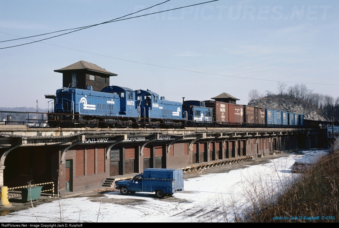 | Two Conrail EMD SW8's, 8673-8686, have just crossed the Delaware River, and pass over the REA station on the ex-Lehigh Valley at Easton, PA. 3/12/1981 |