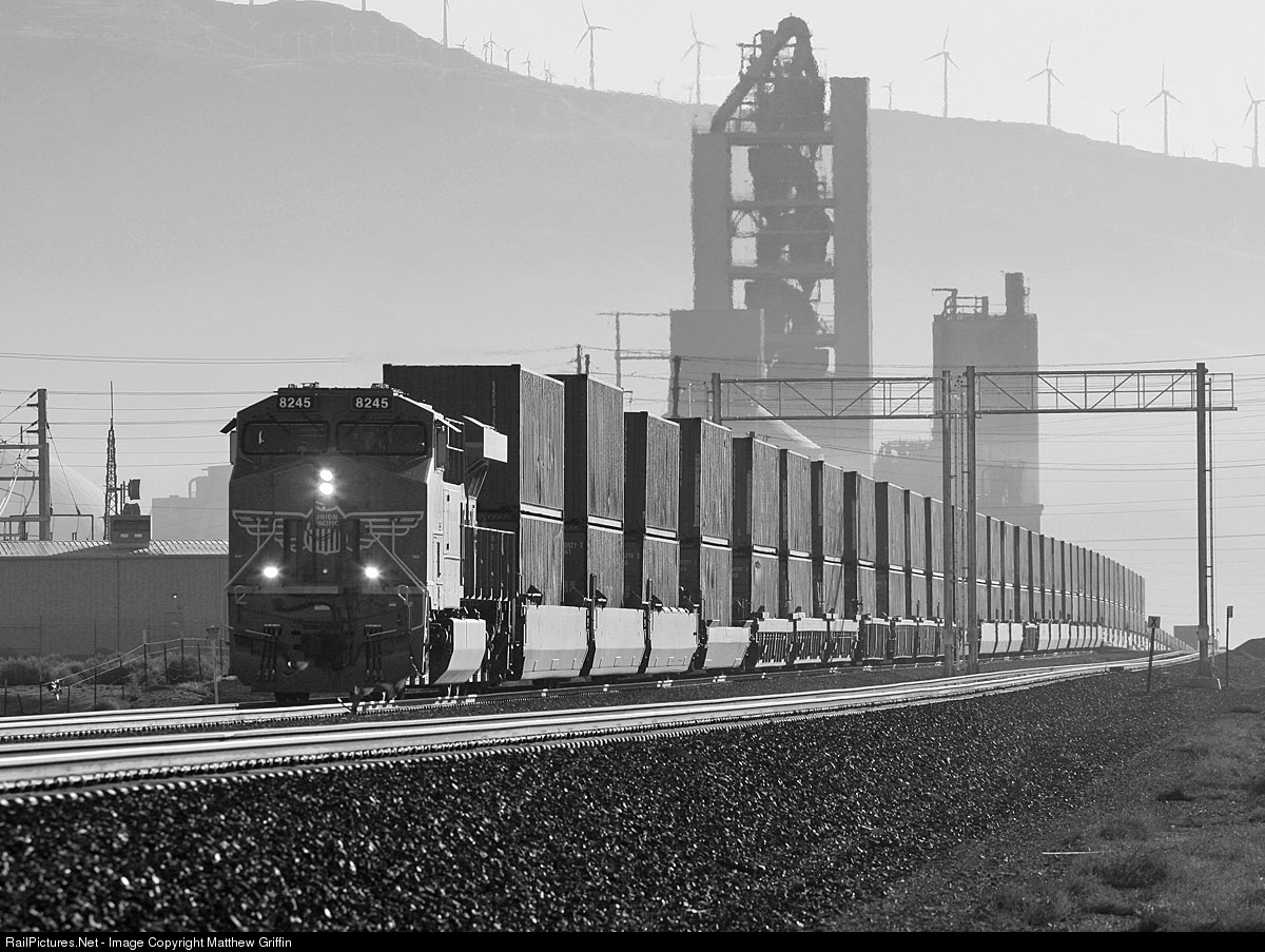 Early morning just east of Tehachapi Summit finds UP 8245 North leading a long Tacoma, WA bound stack train under the new Hi-Wide detectors with the massive Monolith cement plant as a backdrop.
