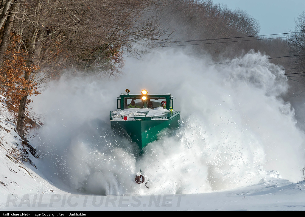 Providence & Worcester operated a plow extra move on Sunday, February 15, making the trip from Worcester, Massachusetts to Willimantic, Connecticut on the railroad's Willimantic Branch (from Plainfield, CT to Willimantic). The P&W is using borrowed Green Mountain Railroad Co. plow X106 and is seen approaching Baltic, Connecticut on Sunday afternoon.