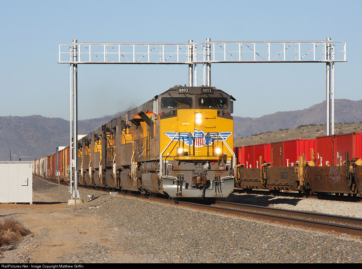 UP 8893 South passes under the new Hi-Wide detector between Tehachapi and Monolith.