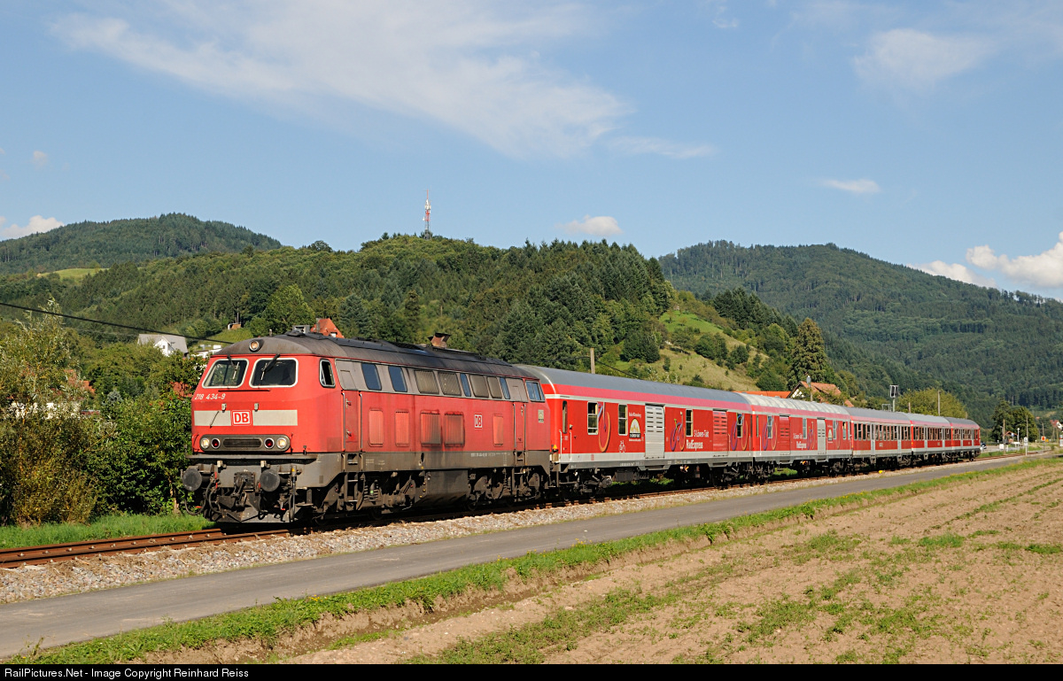 | 218 434 from Regionalverkehr Alb-Bodensee (a subsidiary of DB Regio AG) leads a special train from Bad Griesbach to Karlsruhe on the Renchtal branch line. The 5-car-unit contains two wagons for bicycle transport next to the loco. |