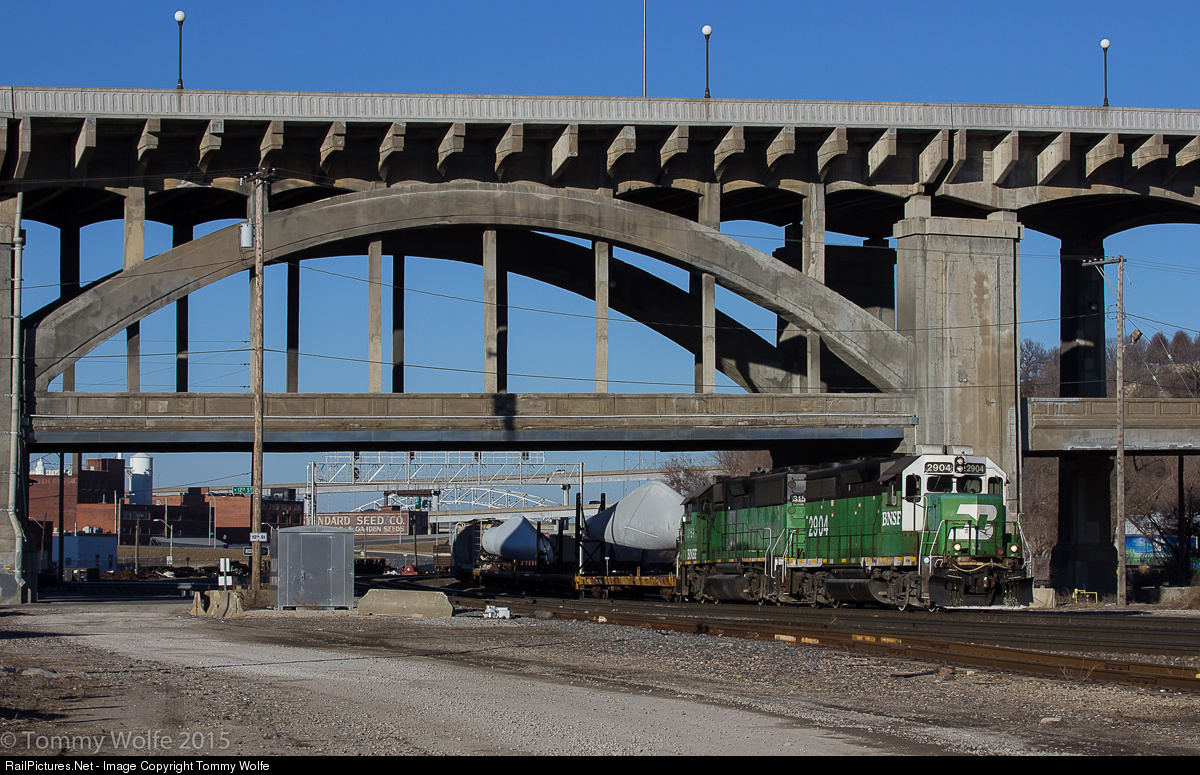 | A pair of former BN Locomotives BNSF 2904, (Built as CB&Q 994 GP35 in August of 1964 it was rebuilt into a GP39E later in its life.) and BNSF 3159 (an Extended 5 Person Cab GP50 was built by the BN in November of 1985 and I believe it still carries its original number on the BN) are seen hauling a decent sized transfer under 12th Street Bridge in the West Bottoms with two windmill blades right behind the locomotives. |