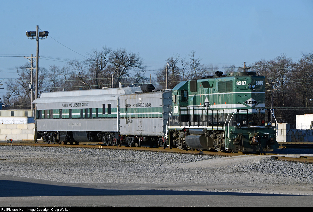 Paducah & Louisville GP39 8507 is in charge of a short business car train in Louisville, Kentucky, on February 15th, 2015. Along with Power Car #10 is heavyweight Business Car #1, the "Bluegrass State." PAL 8507 was built in July 1970 as Atlanta & Saint Andrews Bay 507, later becoming VMV Leasing 8507 before being acquired by the PAL. Here it is as ASAB 507.