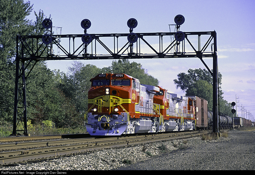 | BNSF 4701, 4702, 4700 pass under the signals at Erie, PA on their way west with a Conrail freight. |