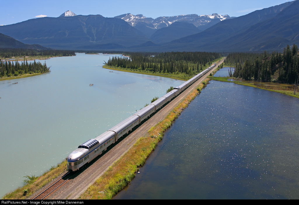 Surrounded by the mountains of Jasper National Park, VIA Rail train No. 1 passes Windy Point west of Devona, Alberta, on July 11, 2014. Carrying the markers on the 23-car stainless-steel streamliner is dome-observation “Revelstoke Park.” The train is skirting Jasper Lake and will soon be cooling its heals at a station and service stop in Jasper.
