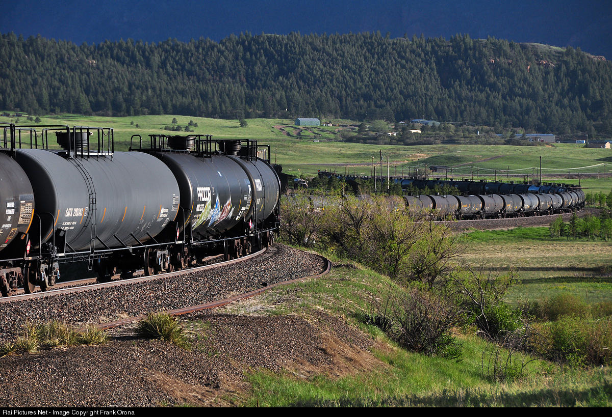 | From this vantage point it's easy to see how much elevation change this tank train has undergone as it moves off the original Santa Fe track and onto the ex-Rio Grande right of way. What isn't seen is the fact that as the track gets closer to Palmer Lake out of sight to the right, it will actually be going up a 1.42% grade since that area is the summit of the line between Denver and Pueblo. Because of this dip from the 1917 government realignment and the grade up to Palmer Lake, this area on the railroad is known as "the sag" and is notorious for finding weak knuckles on heavy trains that pass through it. |