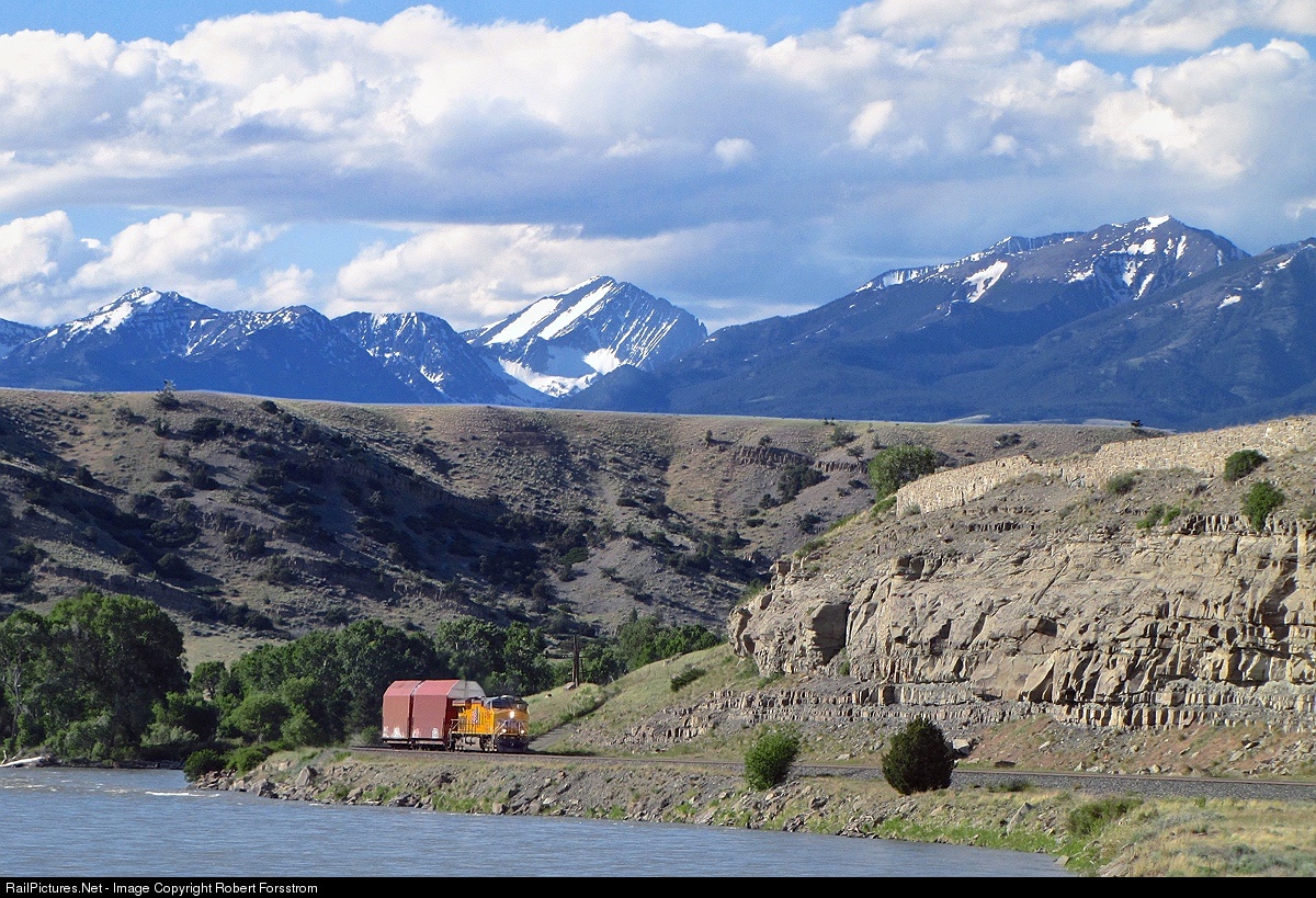 The hottest train on the railroad. - You know it's hot when it's got foreign power (UP) on a foreign railroad (MRL) and only two cars behind. This was a "J" train special out of Fort Worth, TX with a pair of Skybox cars destined for the Boeing 777 assembly plant at Everett, WA. Rounding the Yellowstone River bends near Springdale, MT with the Crazy Mountains in the distance. I was lucky to capture this unique train at several different spots along the MRL mainline, just click here to view.