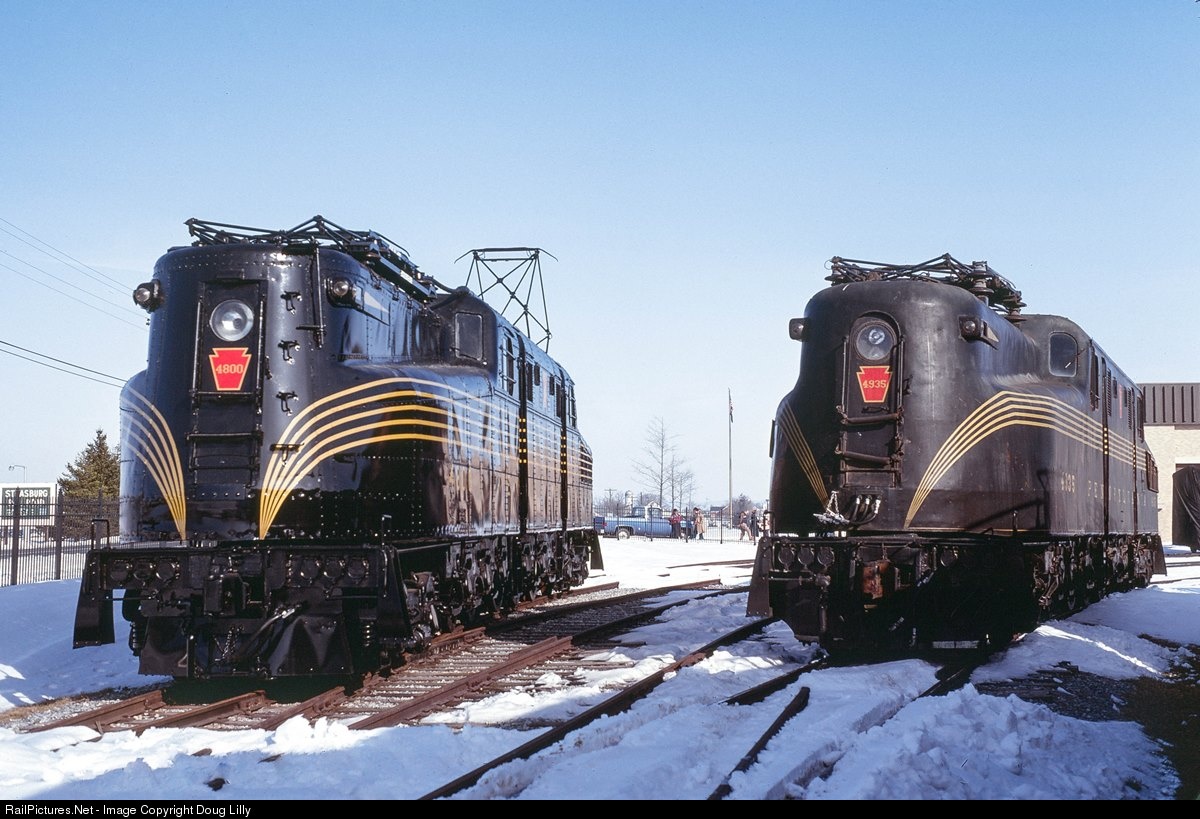 "Old Rivets", the original PRR GG1, has recently been restored to its 1935 appearance, and its three-month-old paint is gleaming. Today, sister 4935, repainted to PRR livery by Amtrak in 1977, joins 4800 at the Railroad Museum of Pennsylvania, having been pushed inside the gate just minutes before this photo was taken.