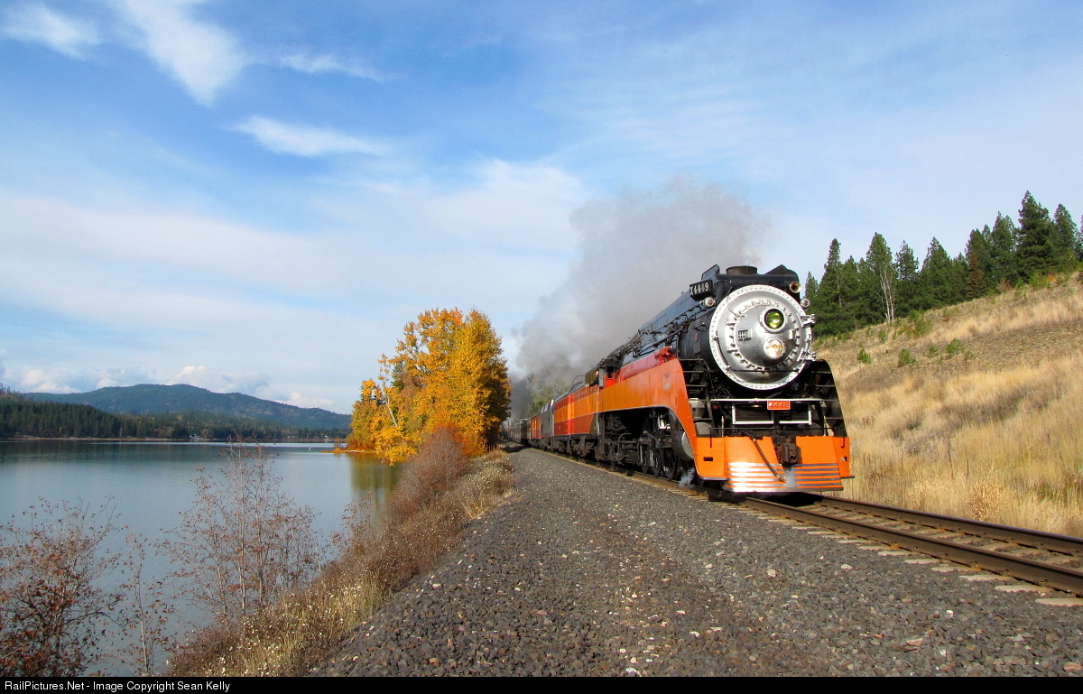 On its cross-country return trip from Train Festival 2009 the Daylight races west along the shore of Cocolalla Lake in North Idaho on an autumn afternoon.