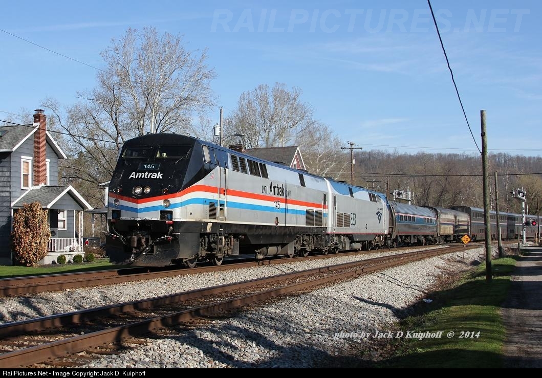 | Amtrak 145-823,leads the Capitol Limited P030, at mp BF-294.5, CSX Pittsburgh sub, at West Newton, PA. 4-20-2014 |