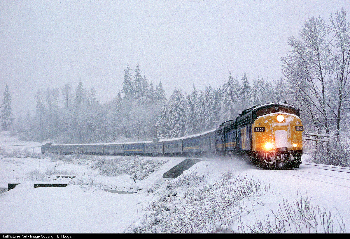 VIA train 2, the eastbound Canadian rolls through the Ft. Langley area west of Mission City, BC in blizzard conditions. At this time the train was still basically a CP train, operating from CP's station in Vancouver, and using CP track across Canada. The consist was mostly CP except for 2 passenger cars and the lead and trailing locomotives, all of which were formerly CN.