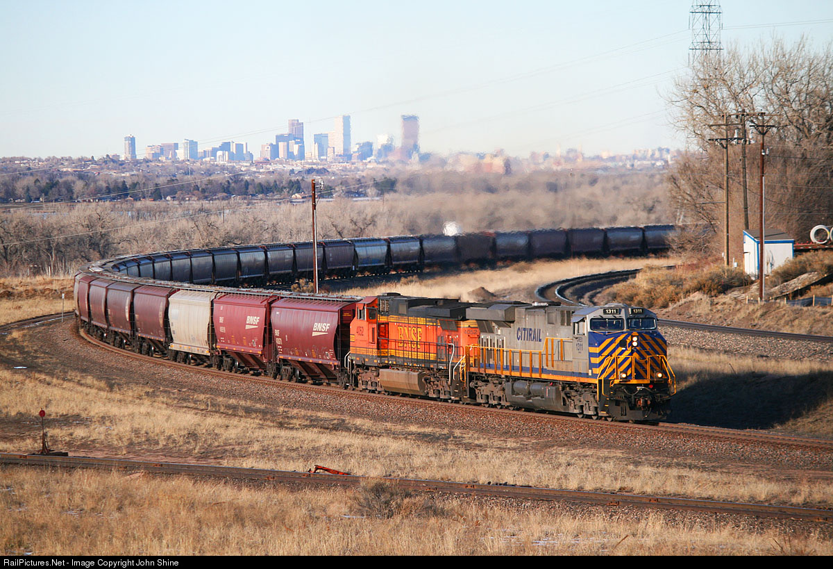 With the Denver skyline seen behind the train, a dirty CREX 1311 heads South with a loaded Grain train.
