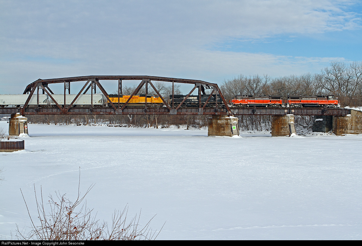 P&W over the Mohawk River. In a double unusual move, the NS auto and intermodal train from Ayer, MA to Chicago rolls down the old D&H with 2 Providence & Worcester units up front and a cut of mixed freight ahead of the racks with no intermodal in the consist. This train runs as 205 on Pan Am and NS.