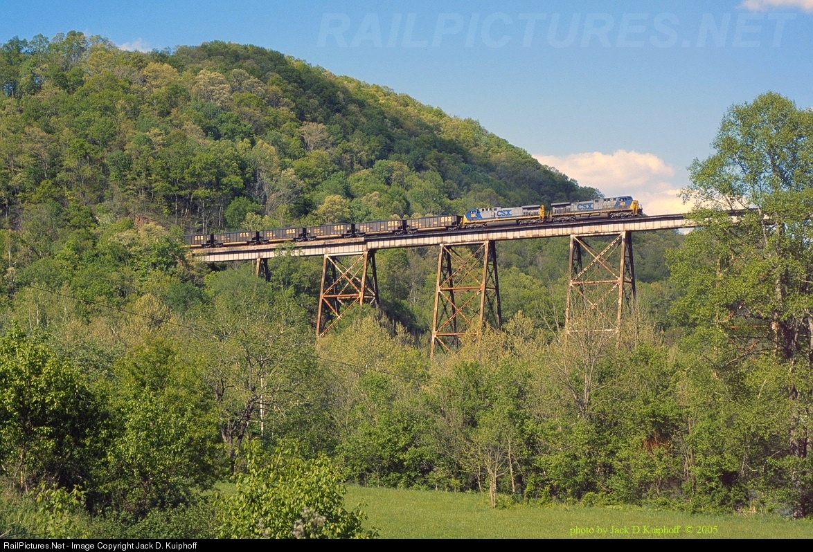 | Crossing the massive ex-Clinchfield Copper Creek trestle is CSX 433-303, with V353, at Copper Creek, VA. 5-03-2005 |