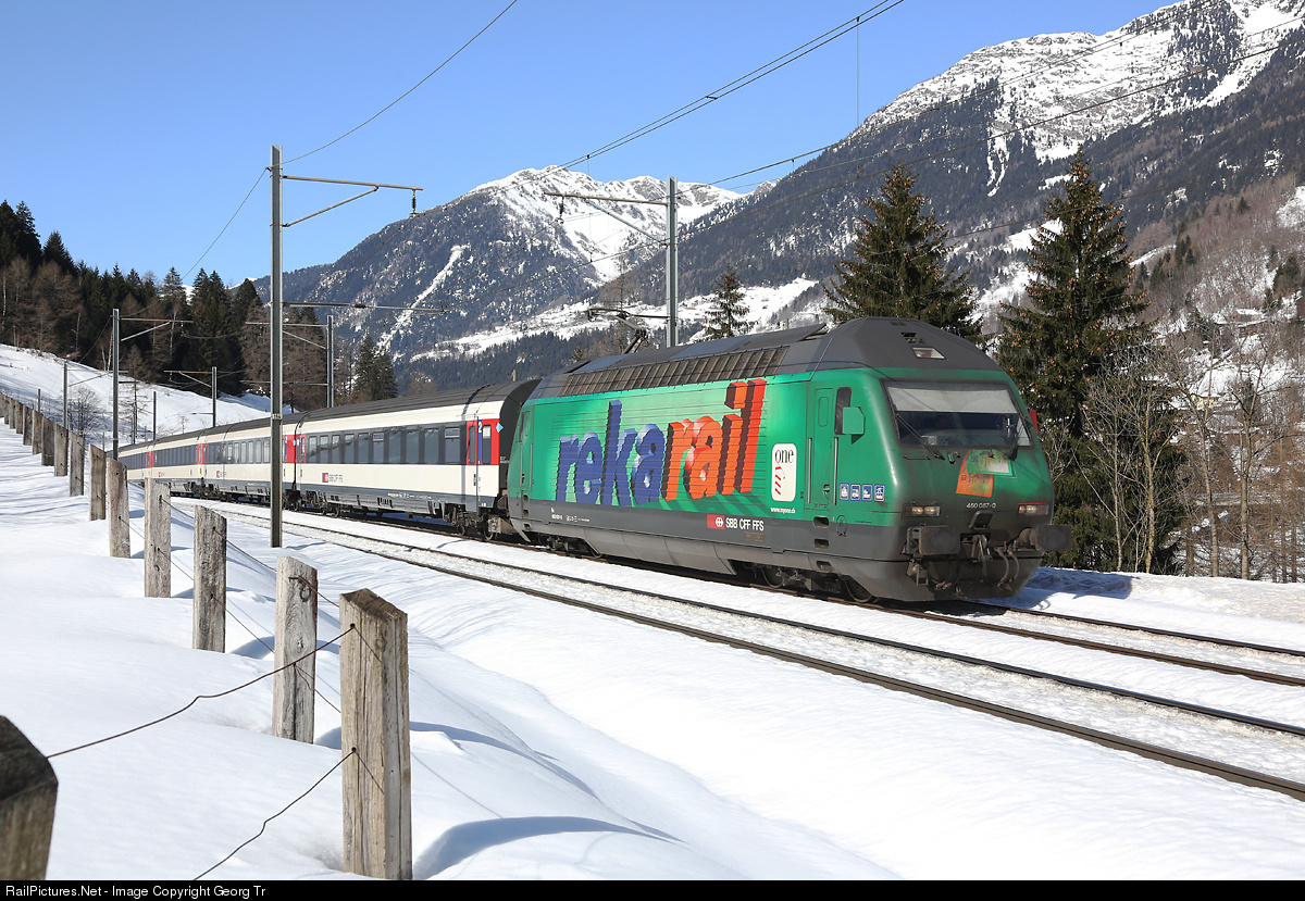 | Re 460 087 in publicity paint "Reka Rail" is pulling Interregio 2417 from Zürich to Locarno on the southern ramp of the Gotthard line. Today (February 20), this locomotive, pulling train 2858 from Zürich to Schaffhausen, had a severe collision with train 18014 in Rafz and will not run anymore for several months. The train driver was seriously injured and 5 passengers received minor injuries. |