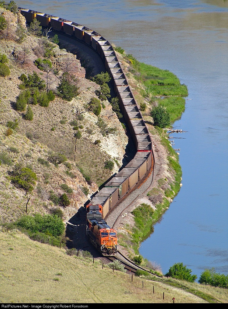| GE ES44AC power playing DP at the back end of a long string of empty coal hoppers snaking along the Missouri River through Lombard Canyon, MT. You can check out some of the additional interesting angles available from this vantage point by clicking here. |