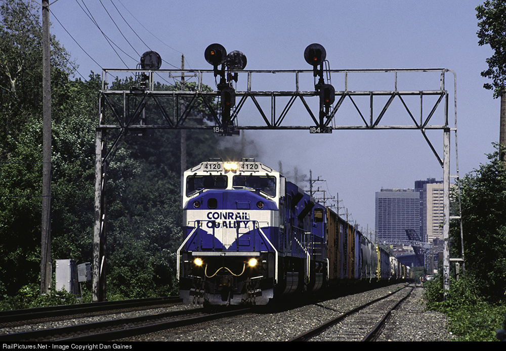 A pair of SD80MACs have just crossed the Cuyahoga River and are now making their way upgrade. Visible in the background is one of the two old B&O lift bridges (in black) that Cleveland has kept in place as an historical monument to the past.