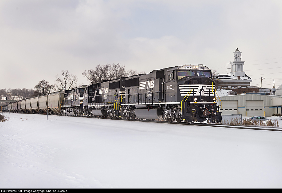 | NS SD75M 2803 leads train 111 through New Albany. The freshly painted locomotive was BNSF 8222, one of seven acquired by NS. Behind it is SD60E 6905 and a C40-9W. |