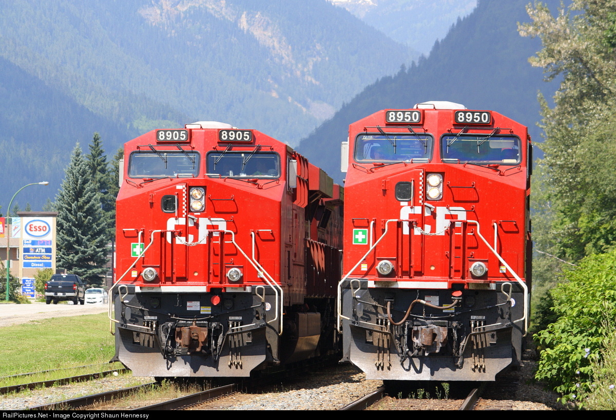 A pair of fresh new CP gevos sit side by side in Revelstoke just west of the crossing for the Railway Museum. The difference in track height making 8950 look superior to 8905!