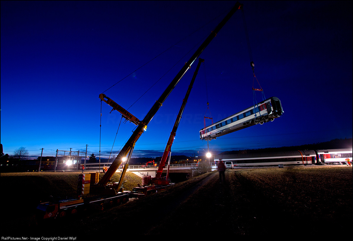 At the late evening, tidying works are still afoot. Due to the severe damage to the vehicles are transported on the road to the workshop at Olten / Yverdon |
