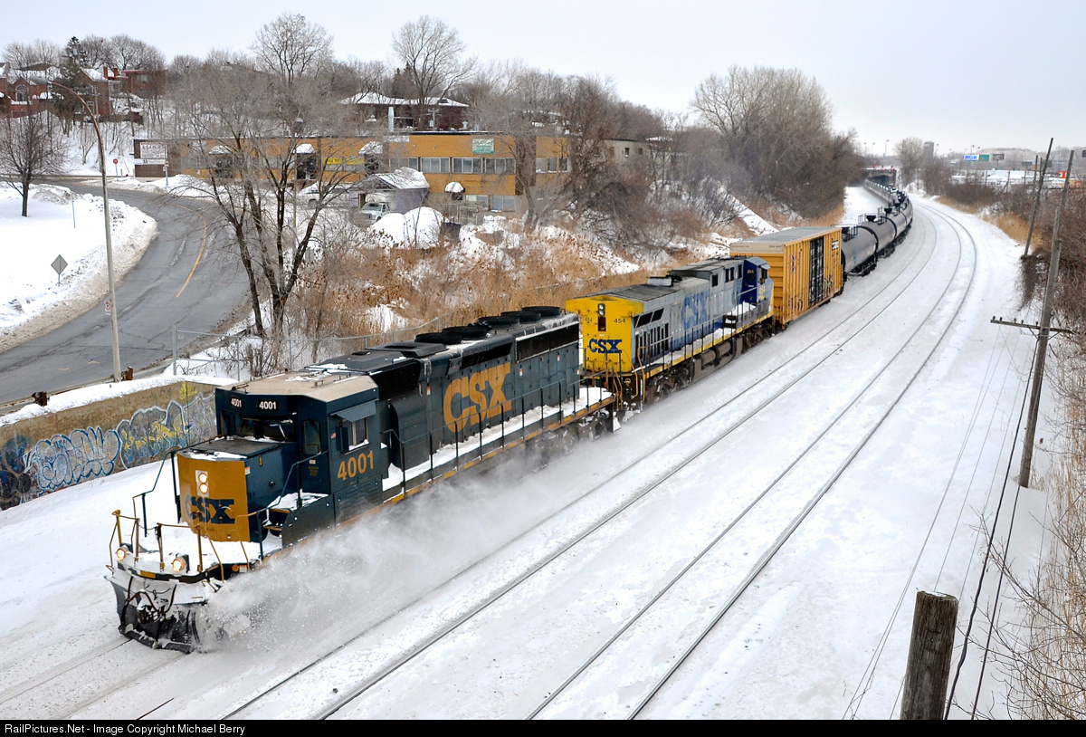 | CSX kicking up the snow.... in Quebec. CN 323 is returning to Montreal a day later than usual with CSXT 4001 and CSXT 454 as power. Usually CN 324 goes from Montreal to St. Albans, VT and comes back as CN 323 on the same day. However last night CN 324's crew spent the night in St. Albans and returned back a day later. Seeing a CSX SD40-3 leading in Quebec is not common at all. |