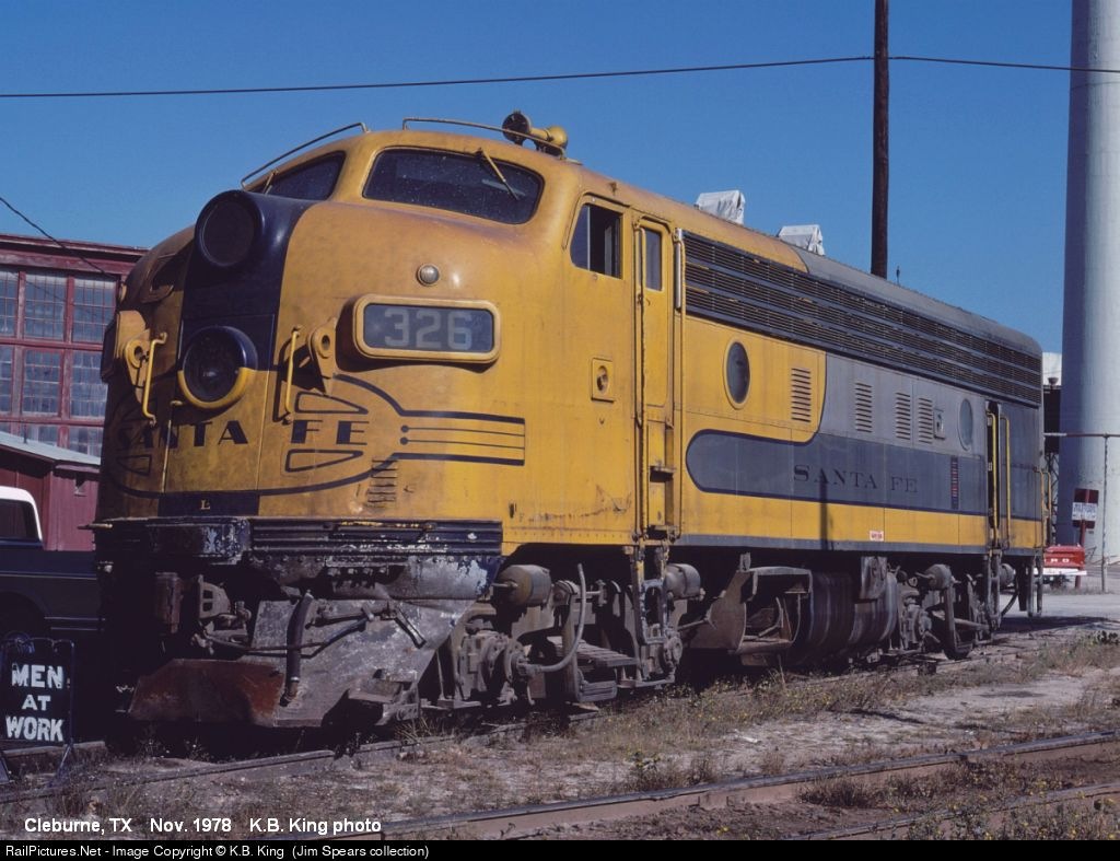 RailPictures.Net Photo: ATSF 326L Atchison, Topeka & Santa Fe (ATSF) EMD F7(A) at Cleburne, Texas by K.B. King (Jim Spears collection)
