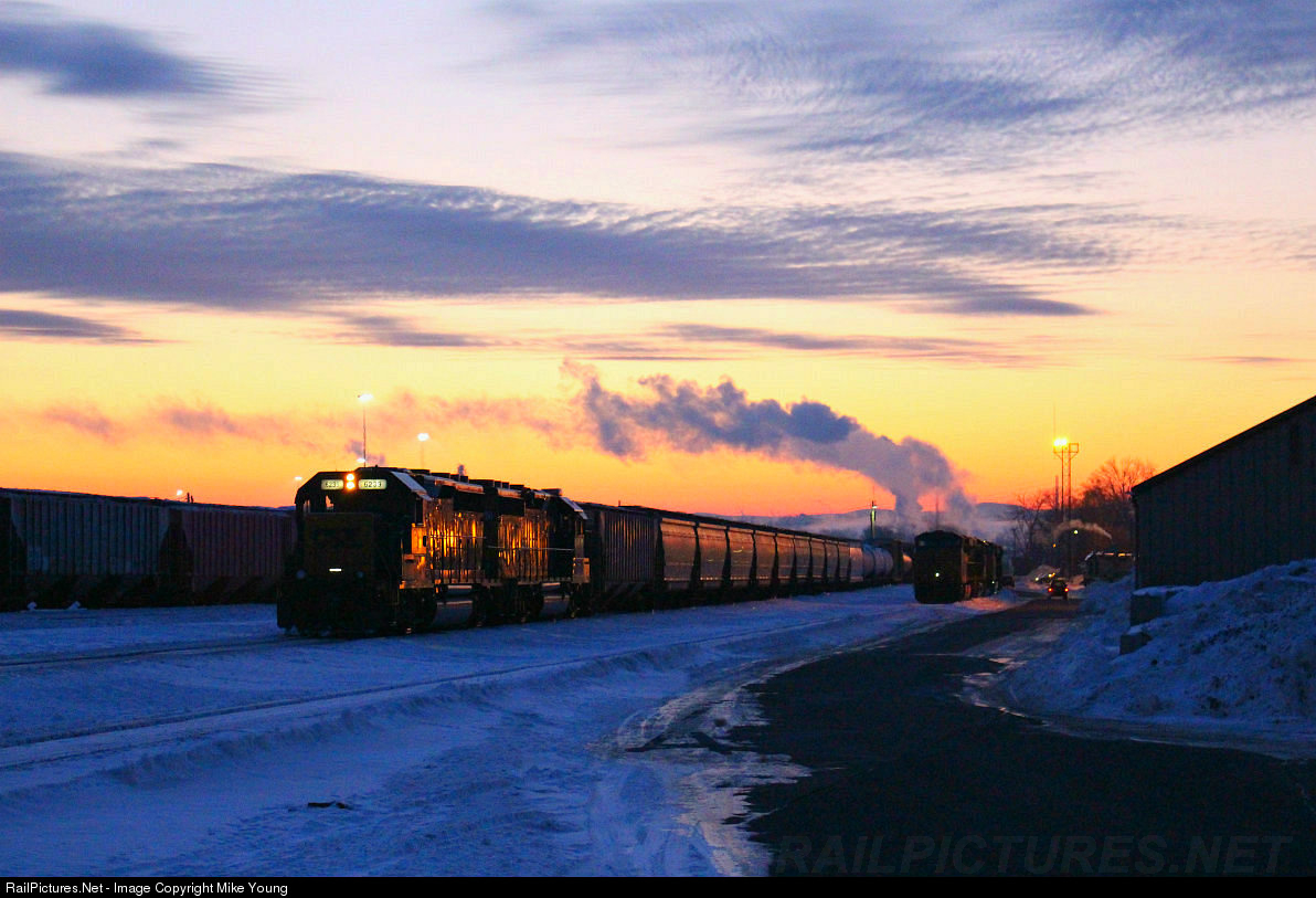CSX Local Y382 works switching cars around in West Springfield Yard with Two GP40-2s as a beautiful Winter sunrise takes place on a cold Saturday morning.