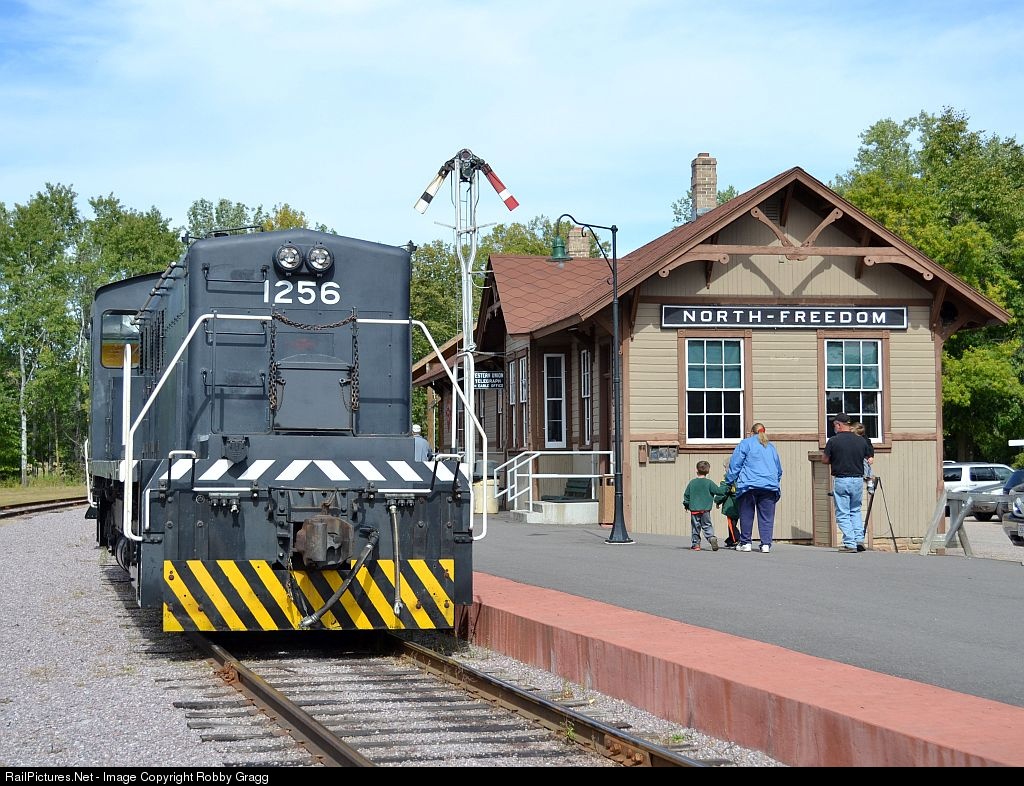 Mid-Continent's RS4TC 1256 sits in front of the old CNW depot in North Freedom.