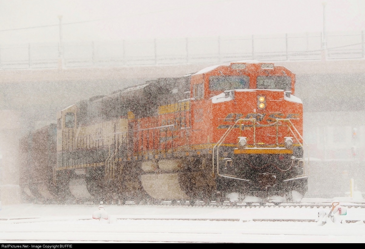 BNSF 9238 (SD70ACe) muscles a string of coal cars through the Denver Yard during a heavy snow storm.