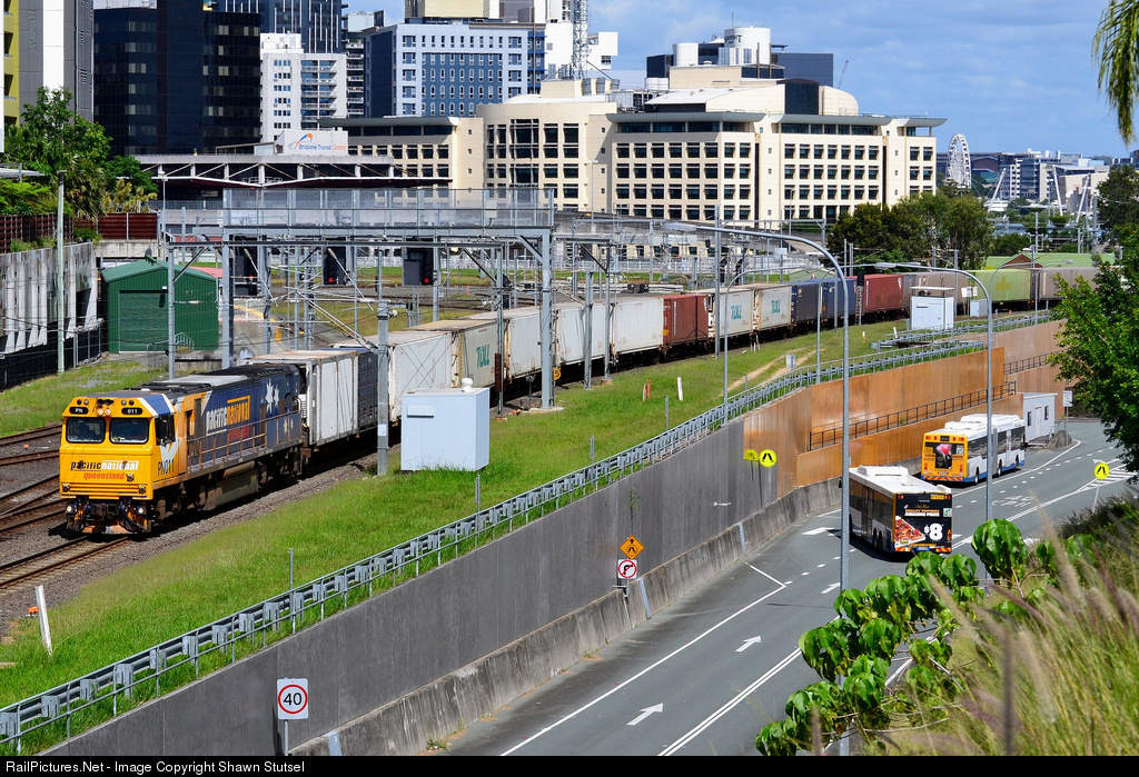 | Pacific National QLD's PN011 powers off the Fork at Roma Street, Brisbane and towards Normanby, with an Intermodal Service, 8UP9 Northwards... |