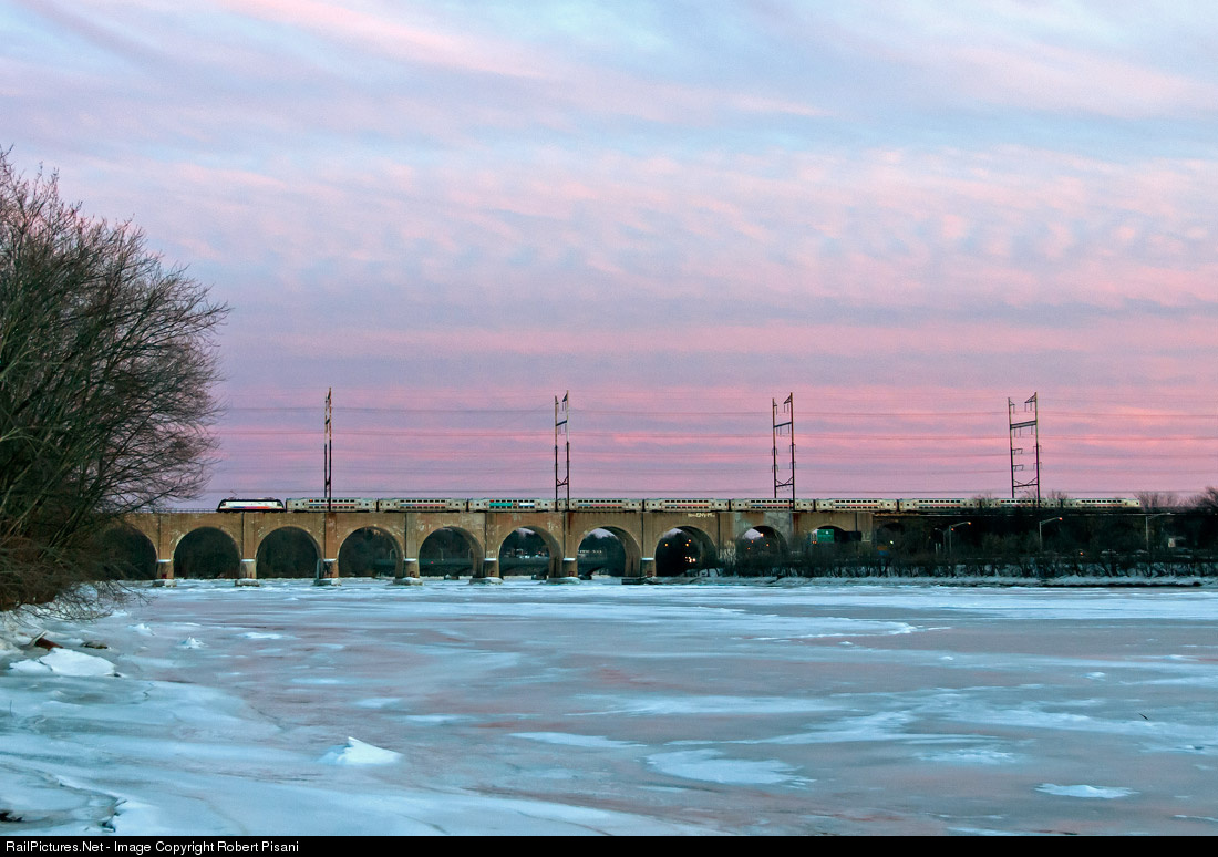 Train 3165 has only two stops remaining as it slows for the stop at New Brunswick Station. The next and last stop will be at Jersey Ave. It will be another bitterly cold evening in New Jersey, and the frozen Raritan River reflects just how cold it has been. A short time before setting, the sun appeared from behind a long bank of clouds, providing this beautiful but cold winter evening view. |