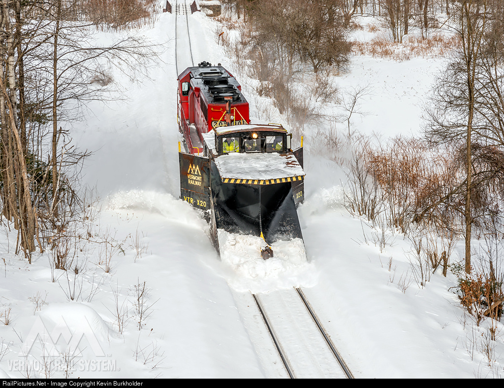 | Ahead of yet another round of expected snowfall for the Green Mountains this weekend, Vermont Rail System dispatched a plow extra to run from Rutland to Bellows Falls to push back banks and make an appropriate walking area for crew should they need to be on the ground and walking alongside a train. The 102-year-old VTR X20 plow was moved by the VTR GP40 301 as it wings back several banks along the Green Mountain RR right-of-way. |