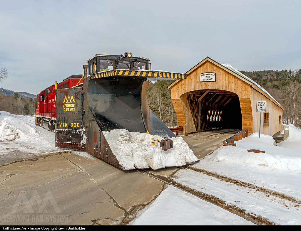 Ahead of yet another round of expected snowfall for the Green Mountains this weekend, Vermont Rail System dispatched a plow extra to run from Rutland to Bellows Falls to push back banks and make an appropriate walking area for crew should they need to be on the ground and walking alongside a train. The 102-year-old VTR X20 plow gets a brief respite as it crosses in front of the Bartonsville Covered Bridge.