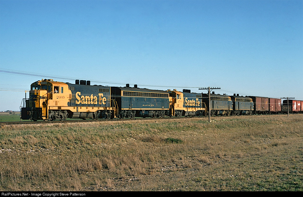 Two Santa Fe CF-7s and three F units tug on northbound tonnage near McGregor, Texas on March 11, 1973, headed for Ft. Worth and on to Oklahoma. Until seven months previous, CF-7 2609 had been passenger F7 No. 29, and 2594 had been freight F7 209C four months earlier.