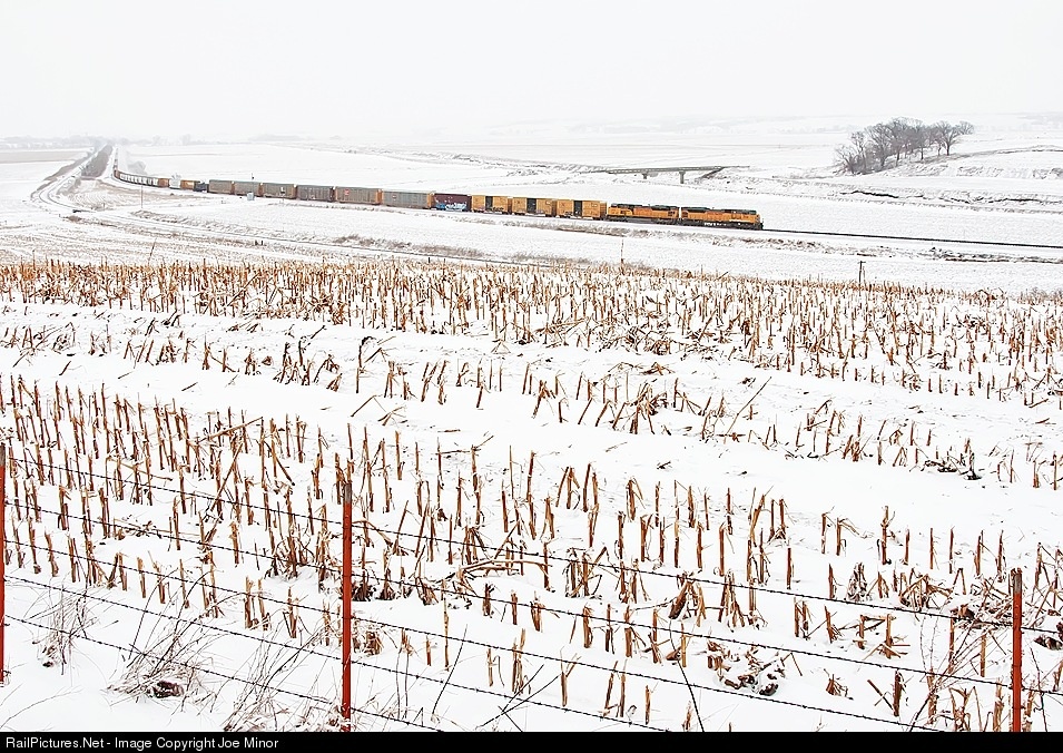 The snow is starting to lighten up as UP 3558 runs a North Platte manifest west outside of Woodbine.