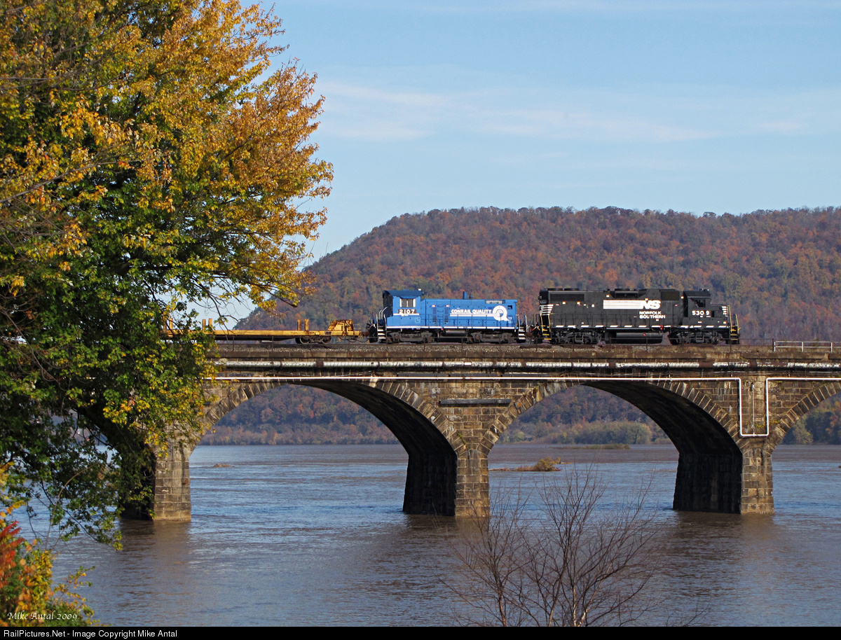 On a refreshingly sunny and warm morning in late October, local job H2W pulls it's train from the confines of Enola Yard and onto the PRR's massive Rockville Bridge, destined for points on the Buffalo Line on the east side of the Susquehanna River. Noteworthy in consist and complimenting the turning Fall foliage is SW1001 2107 of Reading Railroad heritage, still wearing a prominent coat of Conrail blue paint in the year 2009. Like most of it's kind, the unit is now retired by 2015.