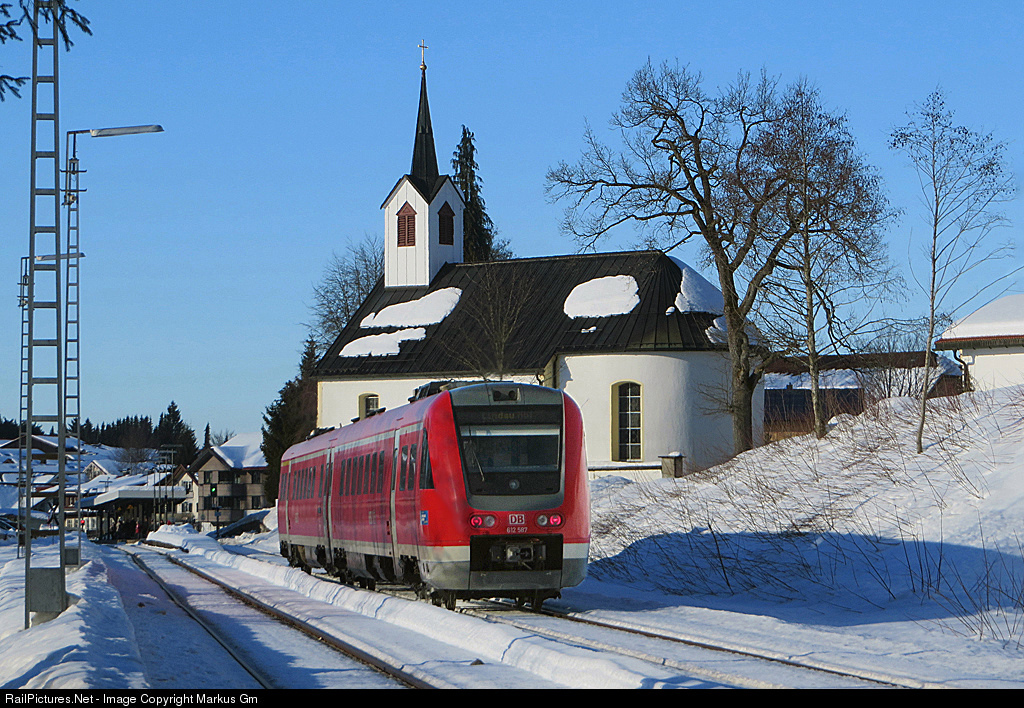 | RegioExpress from Augsburg to Lindau arrives at the station Oberstaufen. In the background the chapel 'Friedhofskapelle St. Martin' |