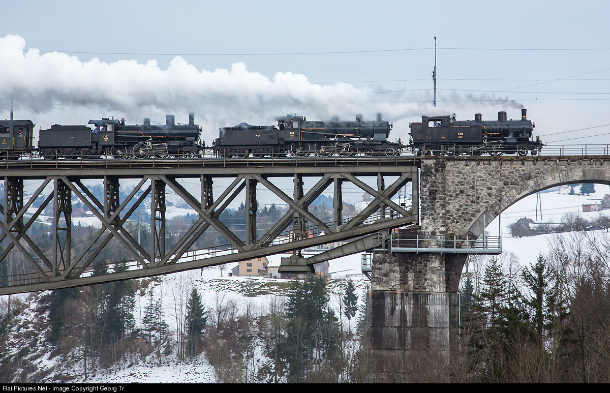 A unique beautiful and perfectly organized large steam locomotive tour from Zurich around the Säntis mountain of "Steam Adventure Tours". With triple traction of Eb 3/5 # 5819, A 3/5 # 705 and B 3/4 # 1367 (all of SBB Historic and based in Brugg), the 12 car train crosses the highest railway viaduct in Switzerland, the Sitter viaduct of the former Bodensee-Toggenburg-Bahn, today Südostbahn (SOB), in St.Gallen.
