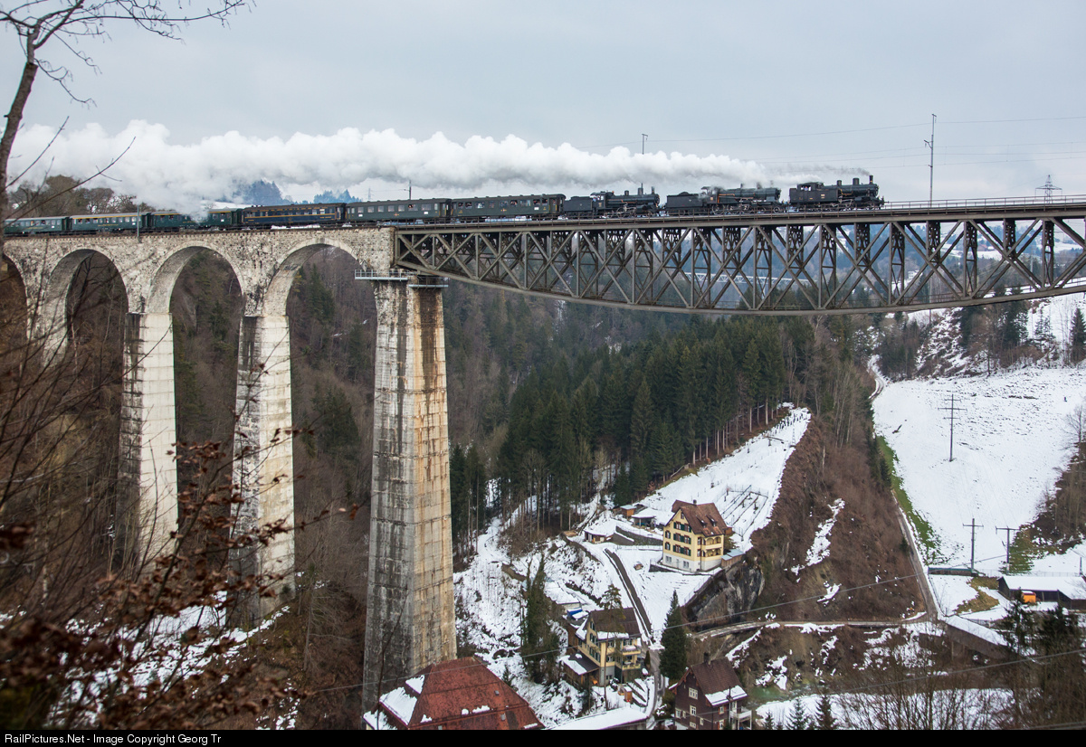 A unique beautiful and perfectly organized large steam locomotive tour from Zurich around the Säntis mountain of "Steam Adventure Tours". With triple traction of Eb 3/5 # 5819, A 3/5 # 705 and B 3/4 # 1367 (all of SBB Historic and based in Brugg), the 12 car train crosses the highest railway viaduct in Switzerland (99 meter high, 365 meter long, built from 1908 to 1910), the Sitter viaduct of the former Bodensee-Toggenburg-Bahn, today Südostbahn (SOB), near St.Gallen.