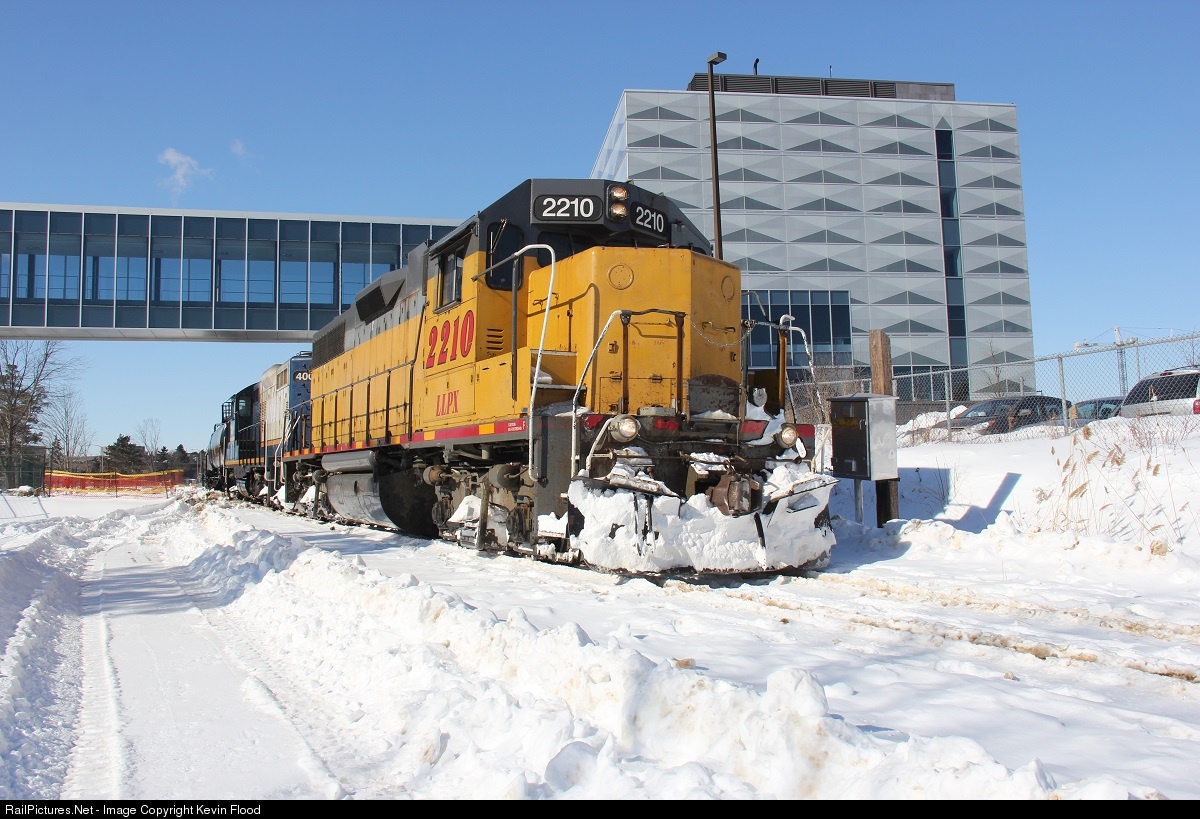 GEXR 584 is creeping slowly south from Elmira to the GEXR mainline in Kitchener with LLPX 2210 and RLK 4001 and five tank cars. They are going past the fairly new Engineering building with overhead passageway to another building on the University of Waterloo campus. Time, 14:29.