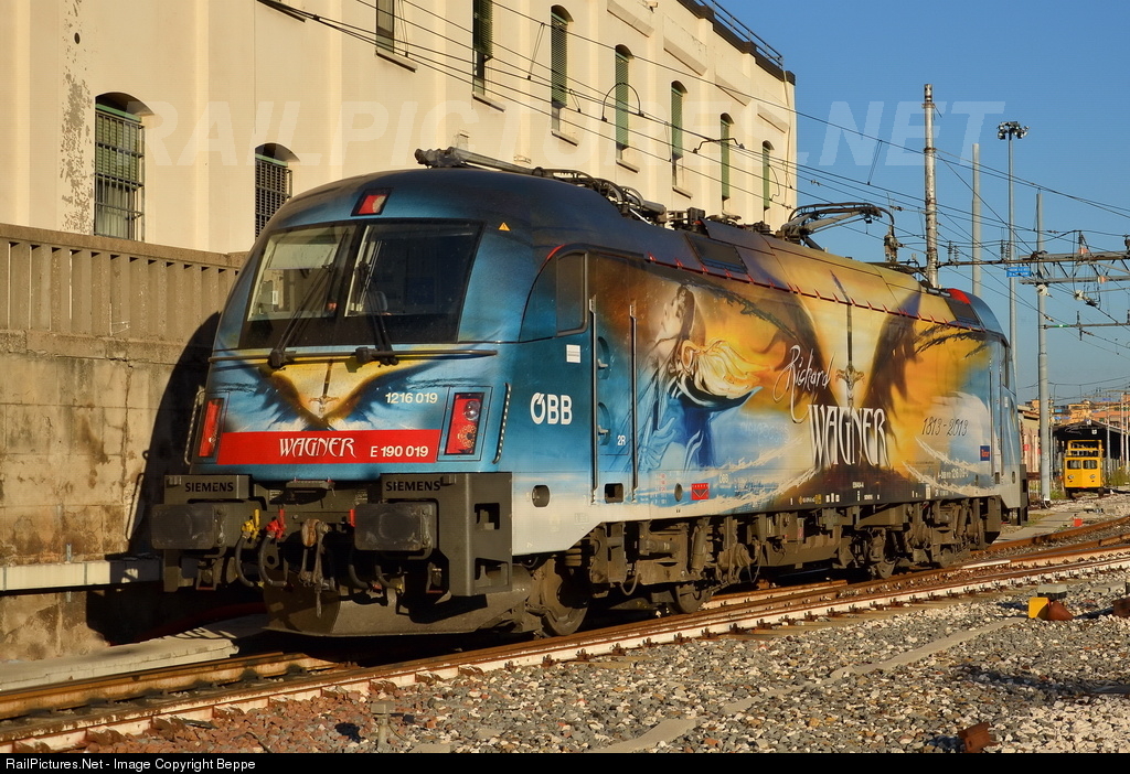 | "Taurus" of ÖBB:1216 019 (E-190-019) with special livery commemorating the 200 years since the birth of the composers Giuseppe Verdi and Richard Wagner. Evident the side dedicated to the German composer Richard Wagner, the opposite side is dedicated to the Italian composer Giuseppe Verdi. |