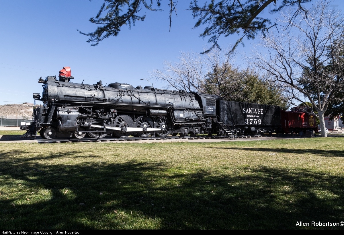 ATSF 3759 was delivered in 1928 as a 3751 class 4-8-4 passenger locomotive. Originally a coal burning locomotive with 73-inch drivers, the fleet was converted to oil in 1936 and rebuilt between 1938 and 1941 with 80-inch drivers. Its regular passenger run was from Los Angeles to Kansas City, with Kingman as a water stop on the way back to Los Angeles. Retired in 1953, the engine had traveled over 2,585,000 miles.